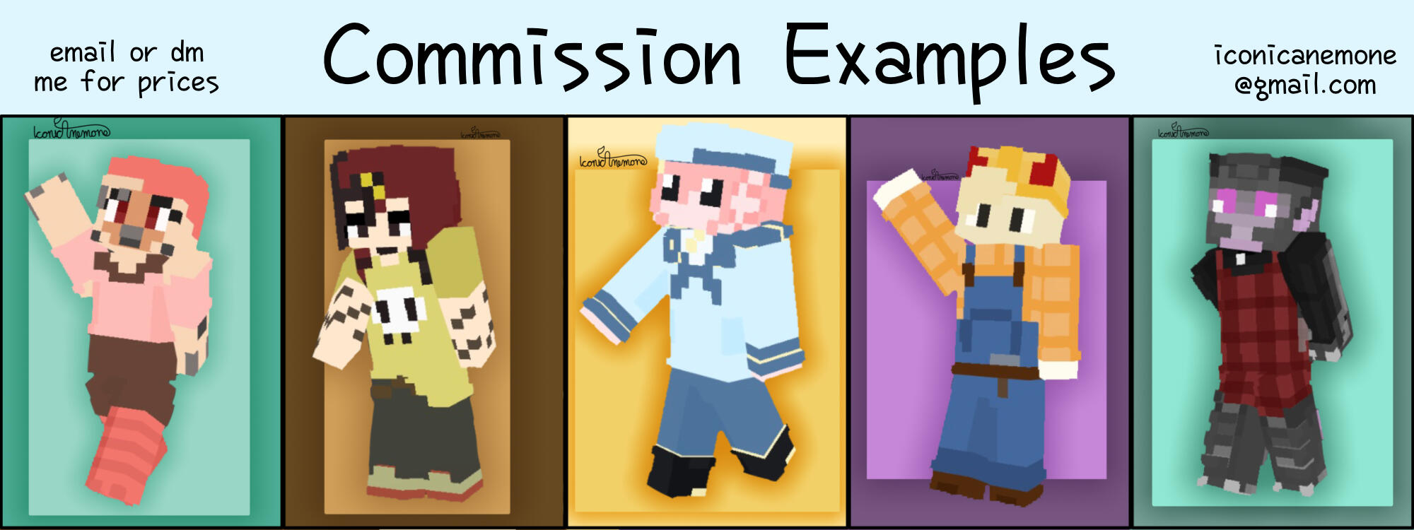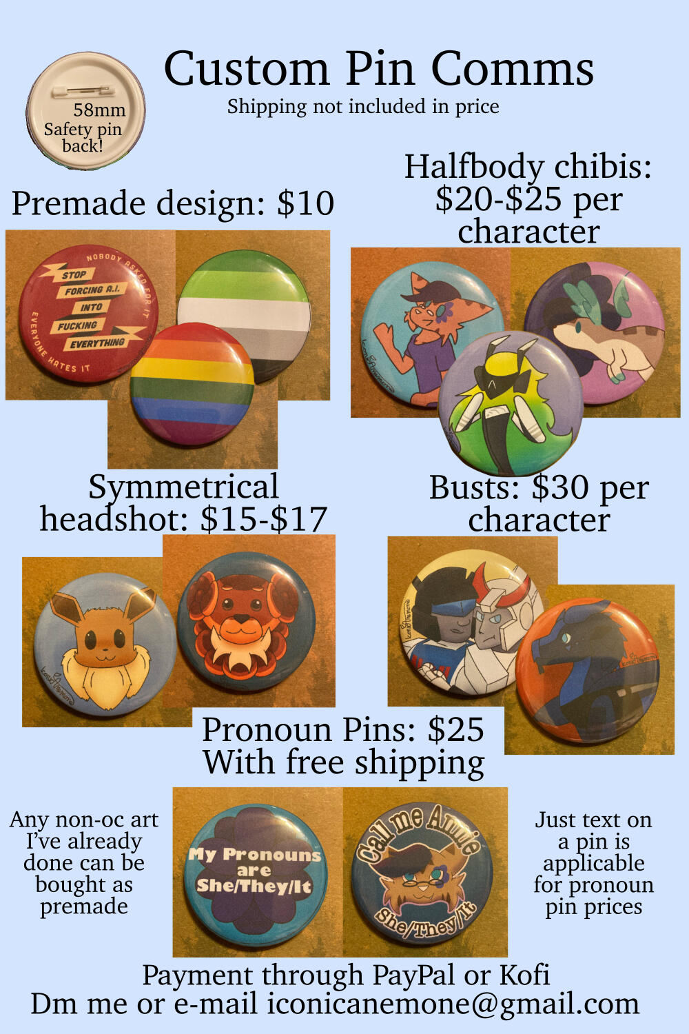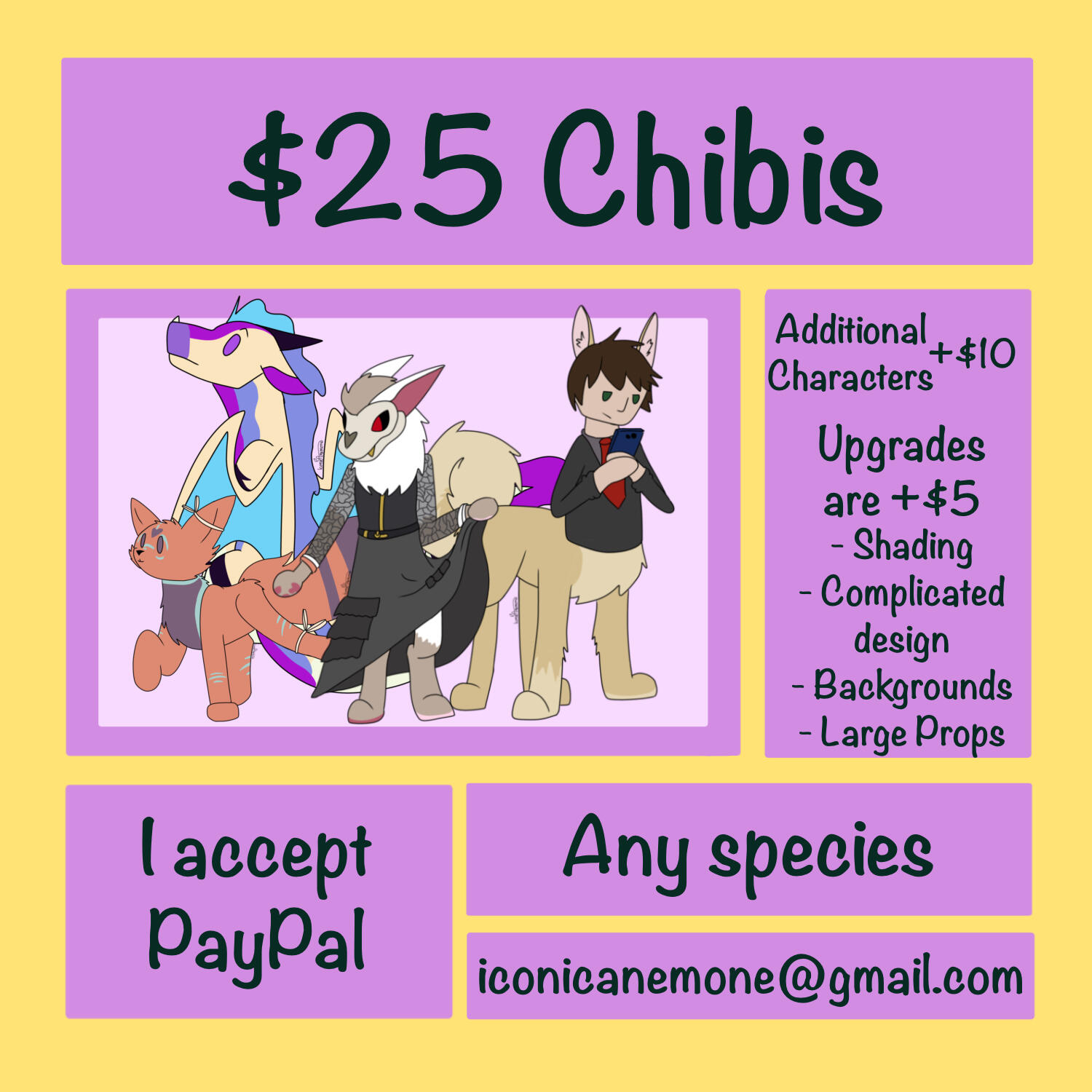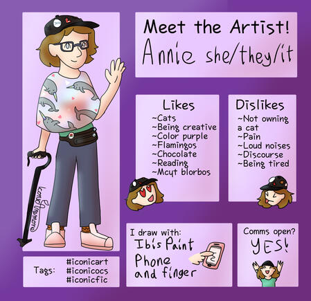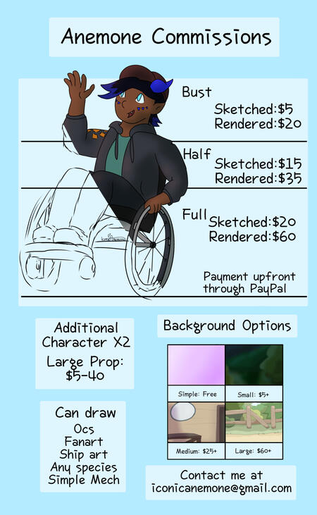 Anything I’m uncomfortable with. Nsfw, hate art, major gore, over complicated characters or anything with a too complicated ref or no ref.My Turnaround Time is within 2 weeks. Anything above $100 may take within two monthsUpdate wips can be provided if asked forI have the right to refuse any commission at any time.Payment must be sent upfront through PayPal, or half upfront half after the sketch for anything above $100Payment is through PayPal’s Goods and Services, or through Kofi with a +$3 feeRush fee will occur on a case by case basis, but anything under $10 will not have a rush feeYou can get a 50% refund if the commission is cancelled before the sketch phase.You may use my art for personal use. Any commercial use must be discussed with me.You must credit me for my work. Crediting includes either a link to a reliable social, an @ on a social I’m on, or a statement including my username and a social you can find me on (example: IconicAnemone on Toyhouse/Tumblr)I will be able to use any work I make as an example, or share it on any of my socials as soon as you receive it unless you ask otherwise